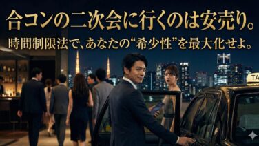 「二次会、どうするー?」合コンの終盤、この言葉が出た瞬間に、あなたの勝負は始まっています。ここで「俺も行く!」と手を挙げる男たち。彼らは恋愛市場における「売れ残り(デッドストック)」です。「まだ俺を買ってください!」と必死にアピールする姿は、閉店間際のスーパーで割引シールを貼られた弁当と同じ。安っぽ...