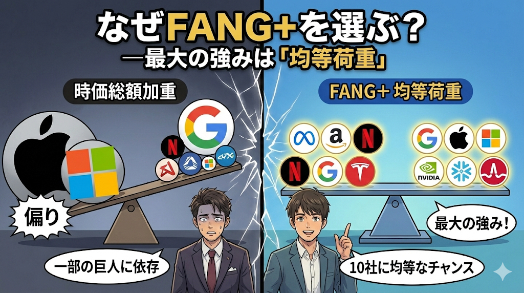 この記事では、なぜ均等比率が長期で有利に働くのか、そしてFANG+が多くの米国グロース投資家に選ばれる理由を解説しますね!